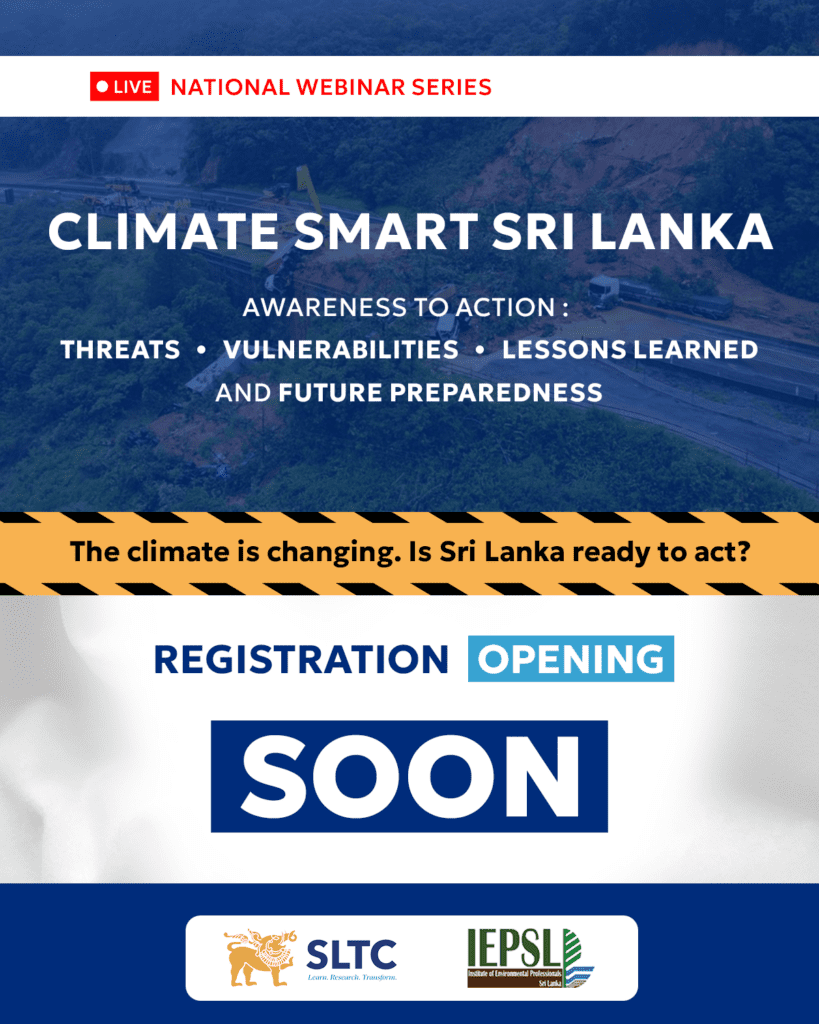 We are proud to announce our upcoming National Webinar Series: Climate Smart Sri Lanka. This series will dive deep into our current threats, vulnerabilities, and the lessons we must learn to ensure future preparedness. Registration is opening soon. Follow our page and stay tuned for the official link to secure your spot in this vital conversation. #ClimateSmartSL #Sustainability #SriLanka #WebinarSeries #ClimateAction #SLTC #IEPSL
