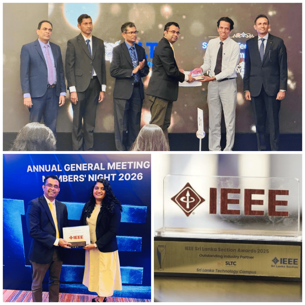 Sri Lanka Technology Campus (SLTC) was honoured with the Outstanding Industry Partner Award at the IEEE Sri Lanka Section Awards Ceremony 2025, held on 12 January at the Taj Samudra Hotel. The event highlighted SLTC’s strong engagement with IEEE and the wider professional community, and was attended by Prof. Chandrika Wijeyaratne ,Vice Chancellor, Dr. Lasith Yasakethu (IEEE Counselor and Senior Treasurer of the SLTC IEEE Student Branch), and Ms. Warunika Hippola (Academic Advisor of the SLTC IEEE Student Branch) This recognition reflects SLTC’s continued commitment to advancing technology, fostering innovation, and supporting professional development in line with IEEE’s mission of advancing technology for the benefit of humanity. We are proud to contribute to IEEE’s mission of advancing technology for the benefit of humanity.
