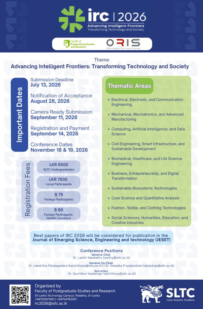 Sri Lanka Technology Campus (SLTC) calls for research paper submissions for the International Research Conference 2026. π¬ Theme: Advancing Intelligent Frontiers: Transforming Technology and Society SLTC- IRC2026 provides a multidisciplinary platform for researchers, academics, and industry professionals to present and discuss innovative research across engineering, computing, life sciences, business, textiles, social sciences, and related fields. π Important Dates β’ Submission Deadline: 13th of July 2026 β’ Notification of Acceptance: 28th of August 2026 β’ Camera Ready Submission: 11th of September 2026 β’ Registration Deadline: 14th of September 2026 β’ Conference Dates: 18β19th of November 2026 Selected high-quality papers will be considered for publication in the Journal of Emerging Science, Engineering and Technology (JESET). For more information, please visit our website:https://irc.sltc.ac.lk/ Organized by the Office of Research & Innovation Services, Faculty of Postgraduate Studies and Research, SLTC.