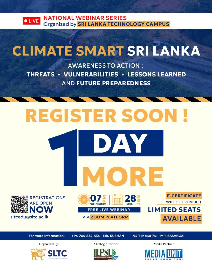 Sri Lanka Technology Campus (SLTC), in collaboration with the Institute of Environmental Professionals Sri Lanka (IEPSL), is pleased to launch the National Webinar Series: Climate Smart Sri Lanka – Awareness to Action.