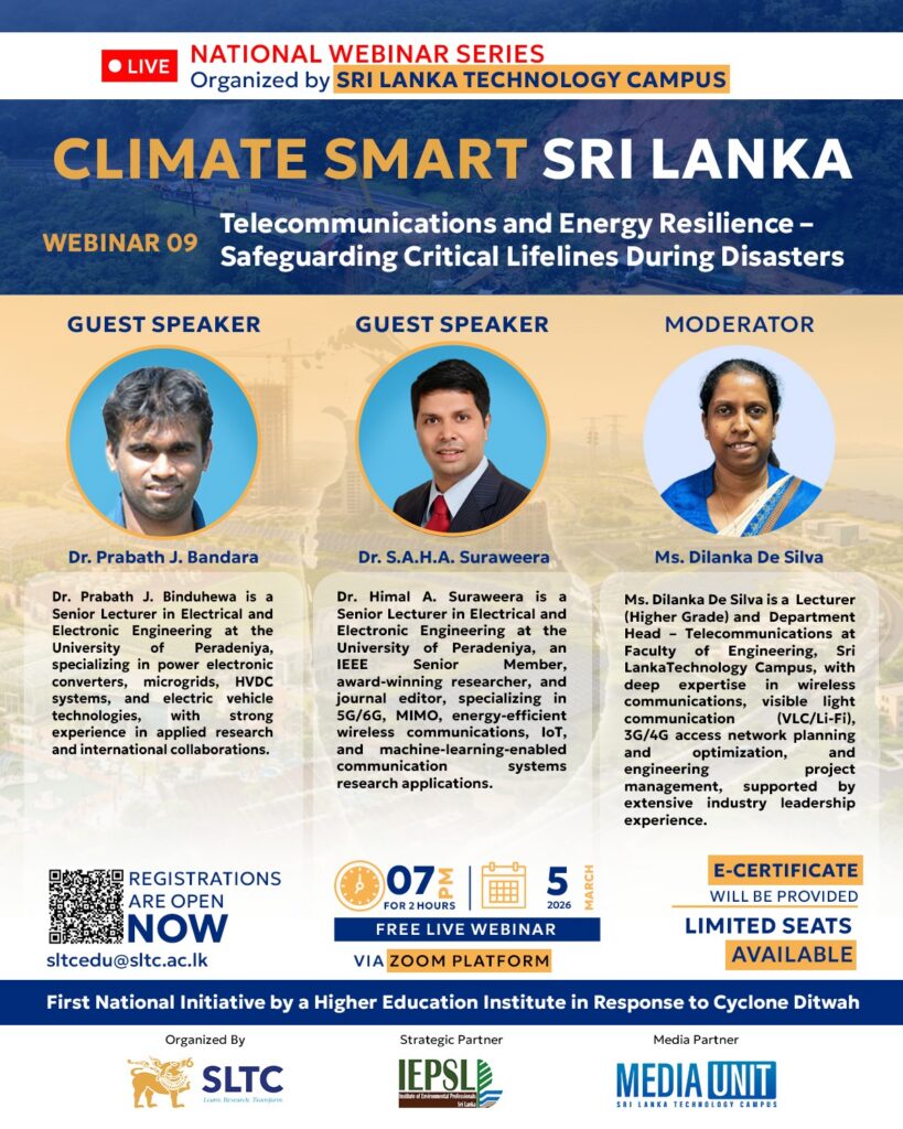Sri Lanka Technology Campus (SLTC) proudly presents the Guest Speakers and Moderator for Webinar 09 — the first national initiative by a higher education institute in response to Cyclone Ditwah. This instalment of the series will delve into the intersection of energy systems, advanced communication networks, and climate action.