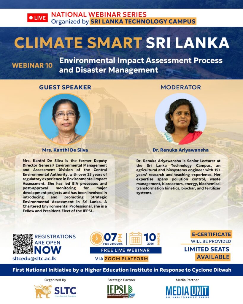 Sri Lanka Technology Campus (SLTC) proudly presents the Guest Speaker and Moderator for Webinar 10 — the first national initiative by a higher education institute in response to Cyclone Ditwah. This instalment of the series will delve into the intersection of Environmental Impact Assessment processes and disaster management.